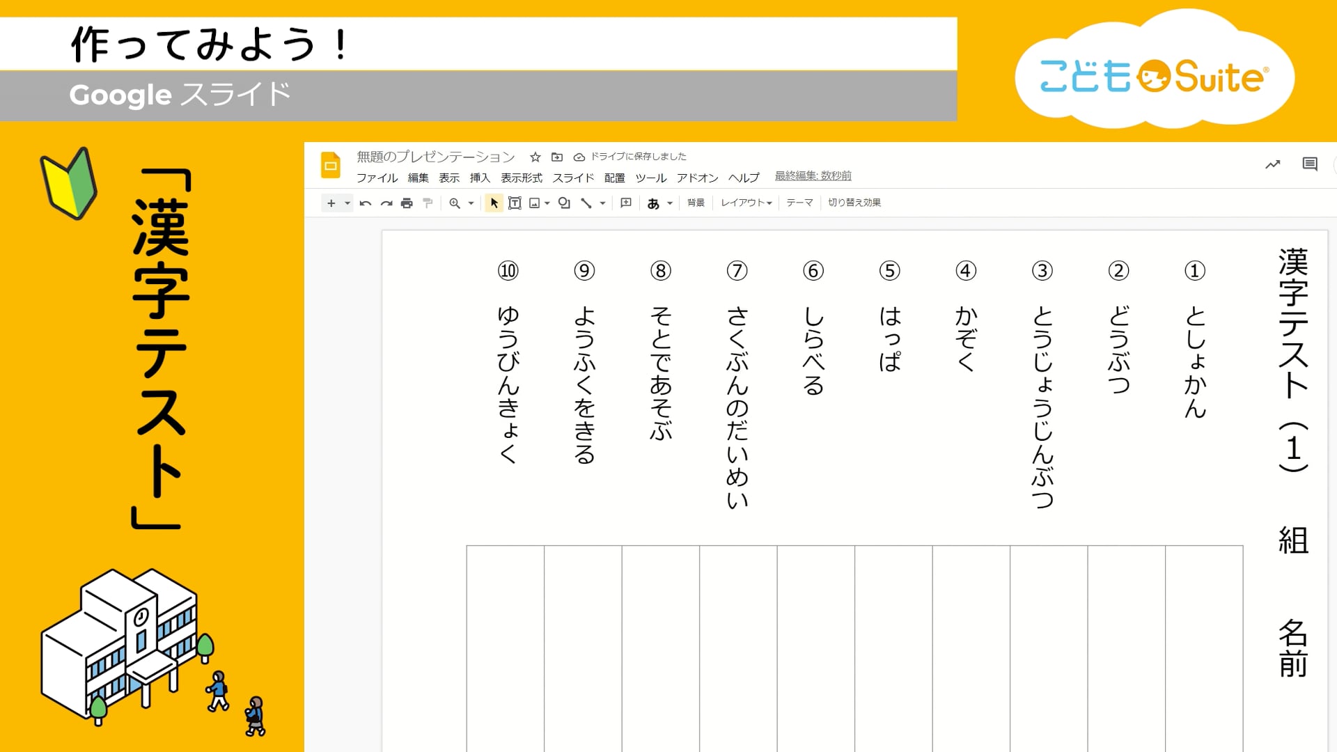 【動画で分かる!】① 漢字テストを作ろう 2023 10/24 使い方 Tips 2023年10月24日 小テストにピッタリ!縦書き機能と表だけで作る漢字テストです。 使い方 Tips Suiteツール(個人版) SuiteツールforEducation こどもSuite スライド まなびSuite URLをコピーしました!